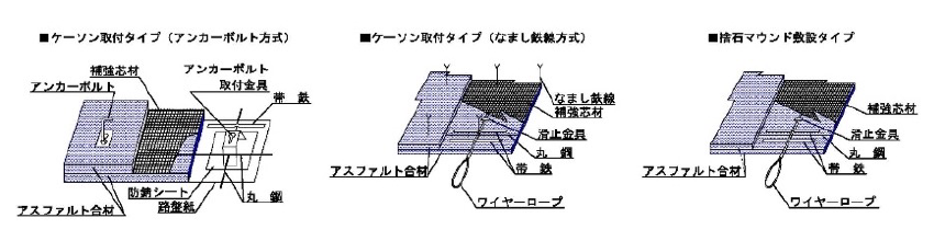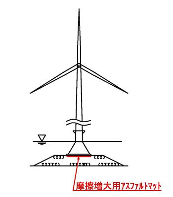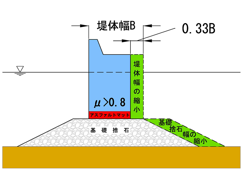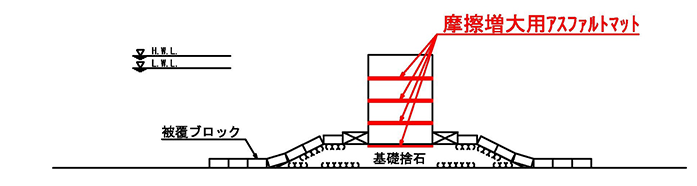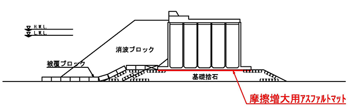 摩擦増大用アスファルトマットは、重力式構造物の底面と基礎捨石マウンド間に敷設することで滑動抵抗力( 摩擦抵抗力) が増大し、断面縮小による大幅なコスト削減に寄与します。