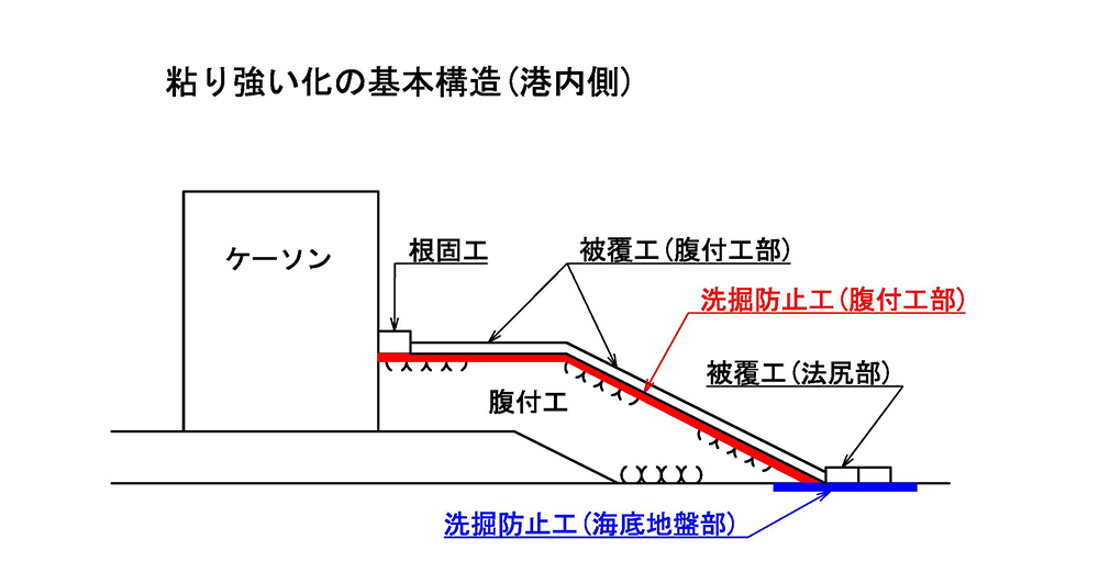 大規模津波に対して、防波堤が変形しつつも倒壊しない『粘り強い構造』を実現するために、アスファルトマットが採用されています。『港湾の施設の技術上の基準・同解説』の粘り強い化の基本構造に、洗掘防止工の必要性が記載されています。