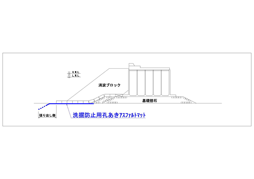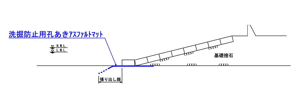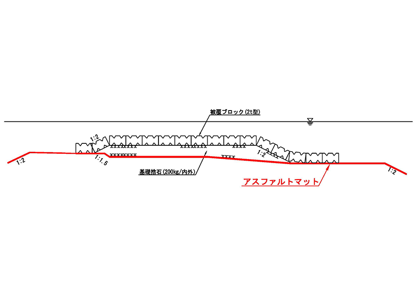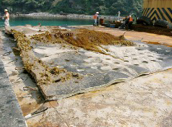 洗掘防止用アスファルトマットは、海洋構造物の捨石マウンドや消波ブロック等の下部や法先に敷設し、堤体の存在により生じる洗掘孔に対して、その自重とたわみ性によってたわみ込ませ、その後の洗掘孔の発達を防ぎ、また、捨石層を通過する底質の吸出しを抑制する海底面被覆材です。構造形式ごとに、現地波浪条件に応じて簡易に設計可能であるため、敷設箇所において経済的かつ効果的に構造物の洗掘防止を実現できる工法です。