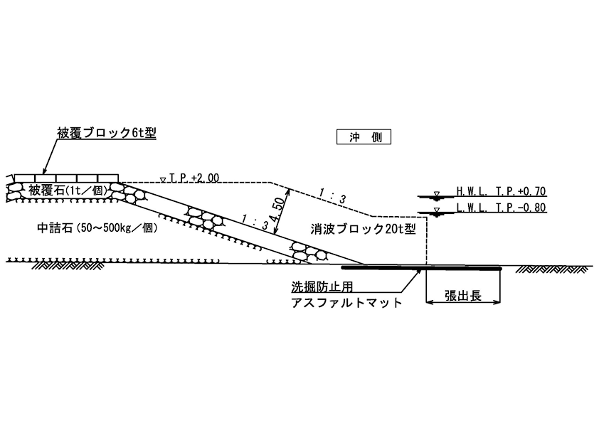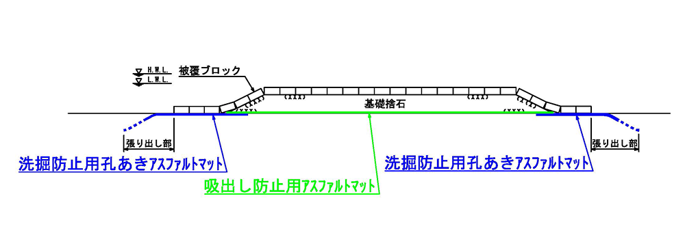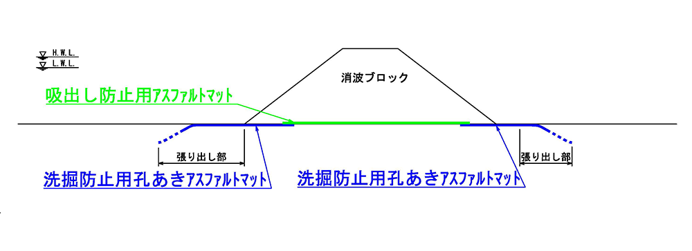 ※アスファルトマットの必要厚さ、張出し長さは構造形式、波浪条件に応じて算出できる。 一般社団法人 漁港漁場新技術研究会 『水産公共関連民間技術確認審査・評価報告書』より
