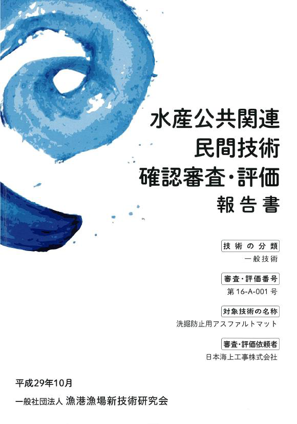 当社の洗掘防止用アスファルトマットは『一般社団法人 漁港漁場新技術研究会』より確認・評価を受けております。