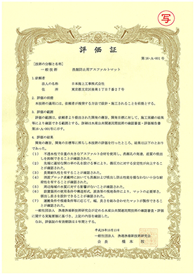 一般社団法人 漁港漁場新技術研究会 評価証 第16-A-001号 洗掘防止用アスファルトマット (2017年10月に交付)