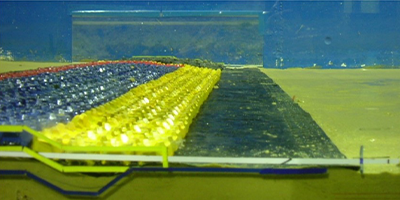 各種水理模型実験を行い、アスファルトマットの効果確認や現地条件に最適な規格(厚さ、張出長さなど)の算定方法を確立しています。
