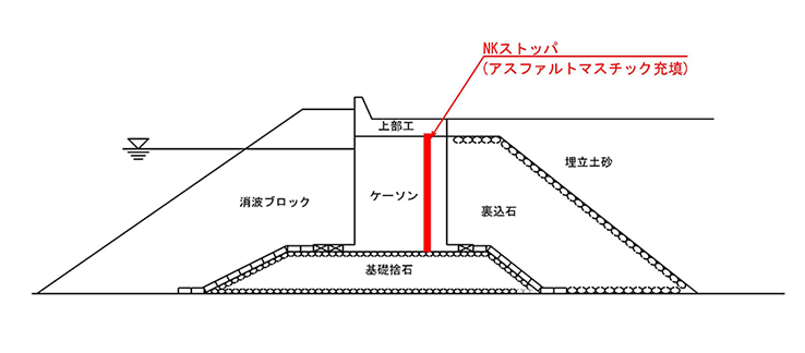 埋立護岸のケーソン目地にNKストッパを建て込み、中詰め材としてケーソンの変形に追随するアスファルトマスチックを充填しケーソン目地からの吸出しを防止する工法です。 施設の重要度に応じてシングルタイプ、ダブル中詰めタイプがあります。
