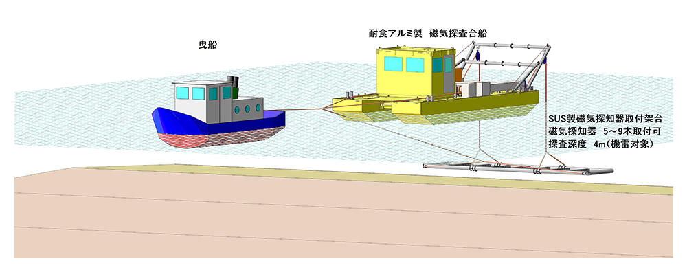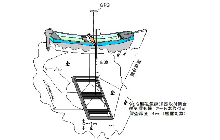 埋没鉄類の位置・深度や埋設鉄管の位置を磁気センサーを使って探知することが出来ます。主に航路や泊地などの浚渫で、埋没不発爆弾との接触を未然に防ぐために行われています。